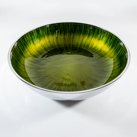 A range of recycled food safe aluminium bowls, servers and dishes that come in various colours, designs and sizes. They are Fair Trade and hand made by Indian artisans.  The products are cast, then rough polished and enamelled before being beautifully finished with a smooth polish.  Every one of these items is individually made to the very highest quality with a hand finished colour enamel inside.